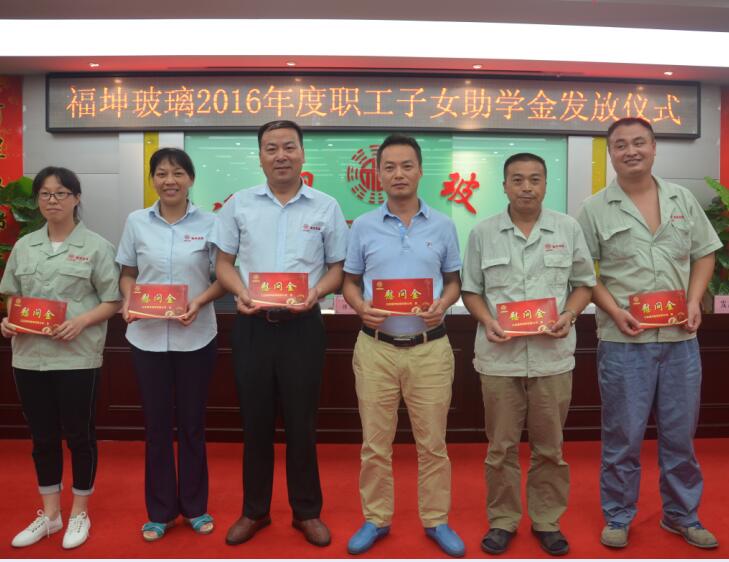 8月27日,江蘇福坤玻璃2016年度職工子女助學金發放儀式在我司西廠五樓會議室進行,董事長、總經理洪愛萍為葉祝建、呂燕、周忠明、張云鳳、殷建農、徐霞等6名員工發放第三批“員工子女助學金”,并代表公司全體同仁祝賀他們的子女如愿考進理想的大學和高中.