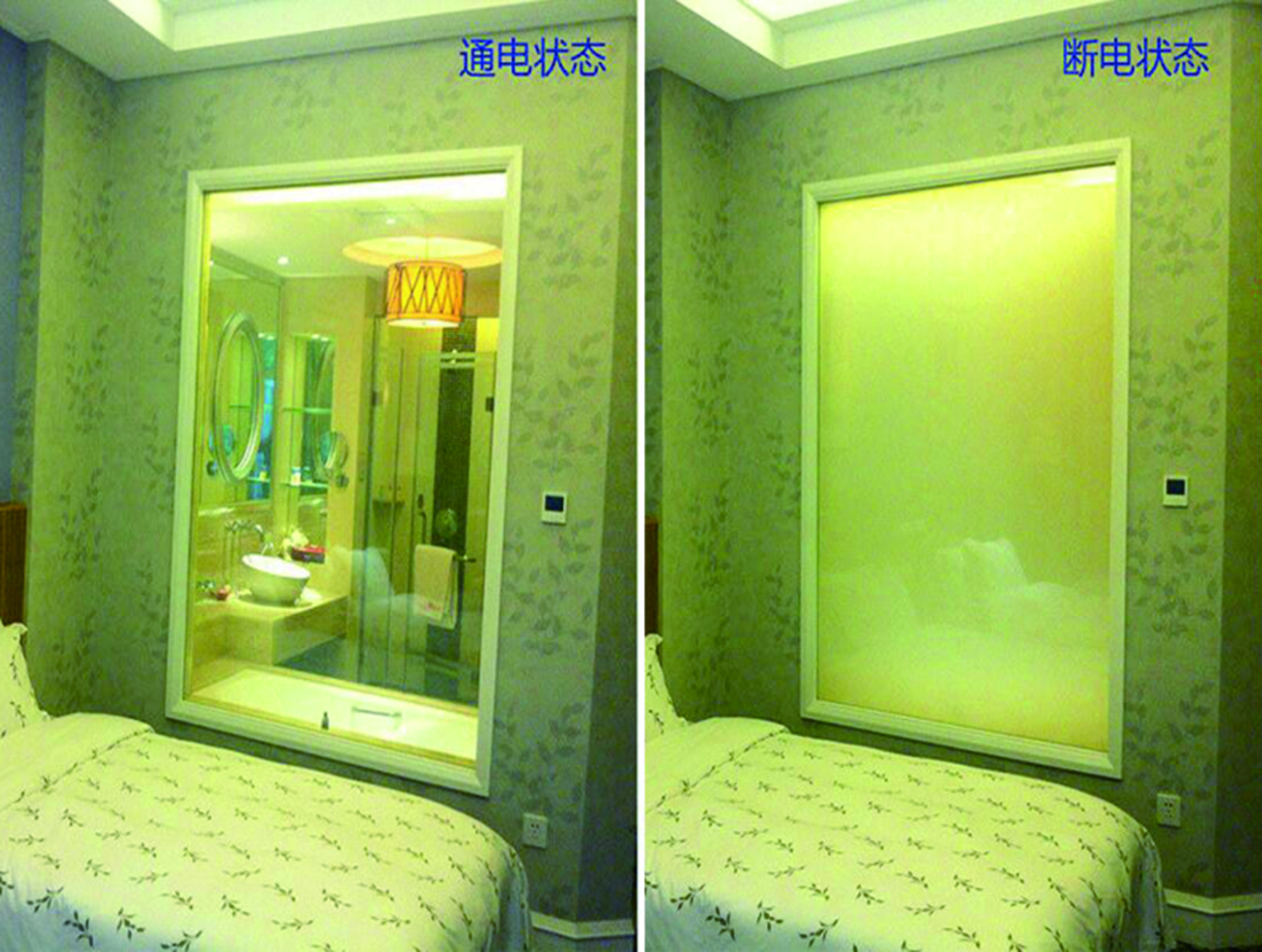 當(dāng)調(diào)光玻璃關(guān)閉電源時(shí),電控調(diào)光玻璃里面的液晶分子會(huì)呈現(xiàn)不規(guī)則的散布狀態(tài),此時(shí)電控玻璃呈現(xiàn)透光而不透明的外觀狀態(tài);當(dāng)給調(diào)光玻璃通電后,里面的液晶分子呈現(xiàn)整齊排列,光線可以自 由穿透,此時(shí)調(diào)光玻璃瞬間呈現(xiàn)透明狀態(tài)。